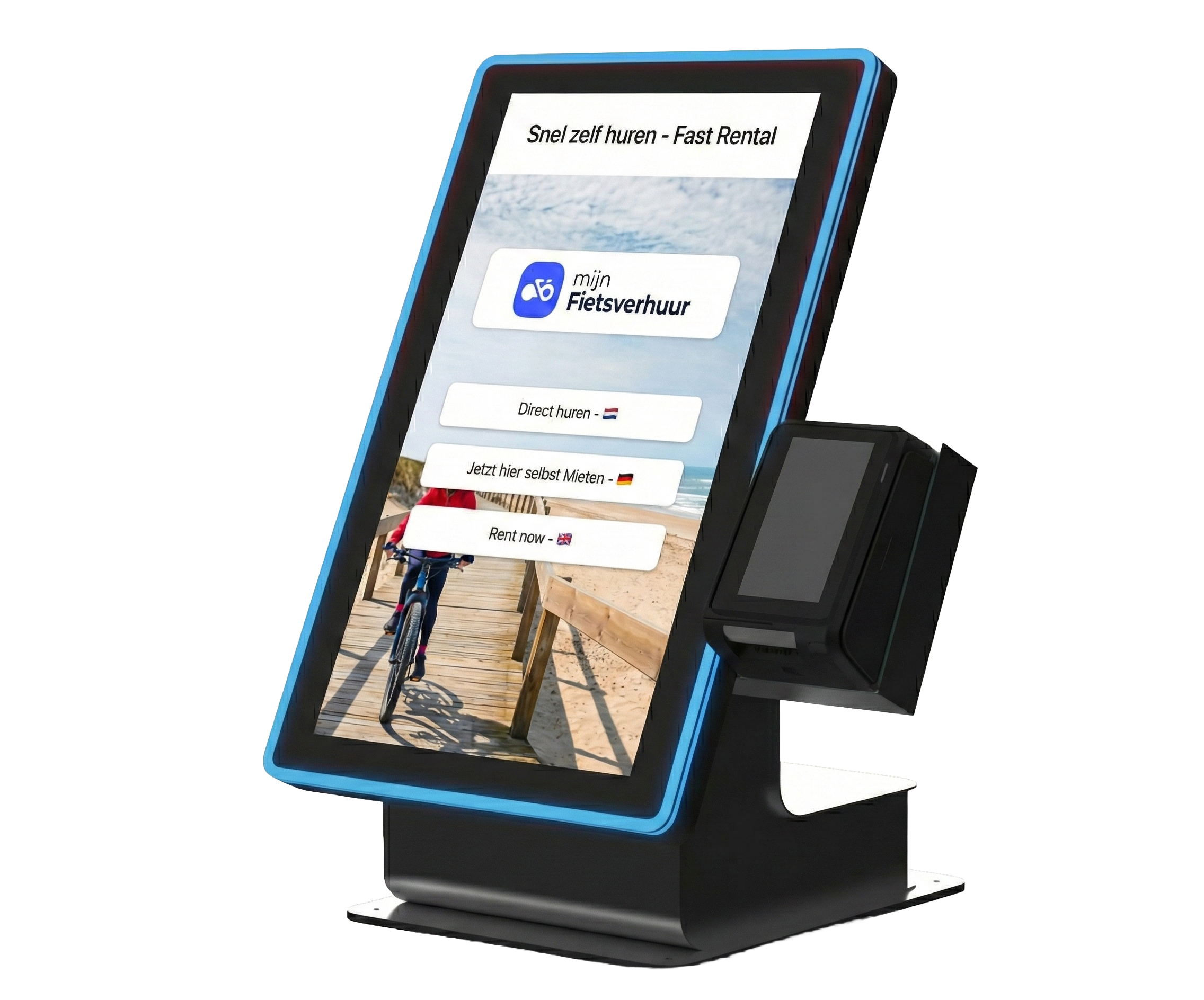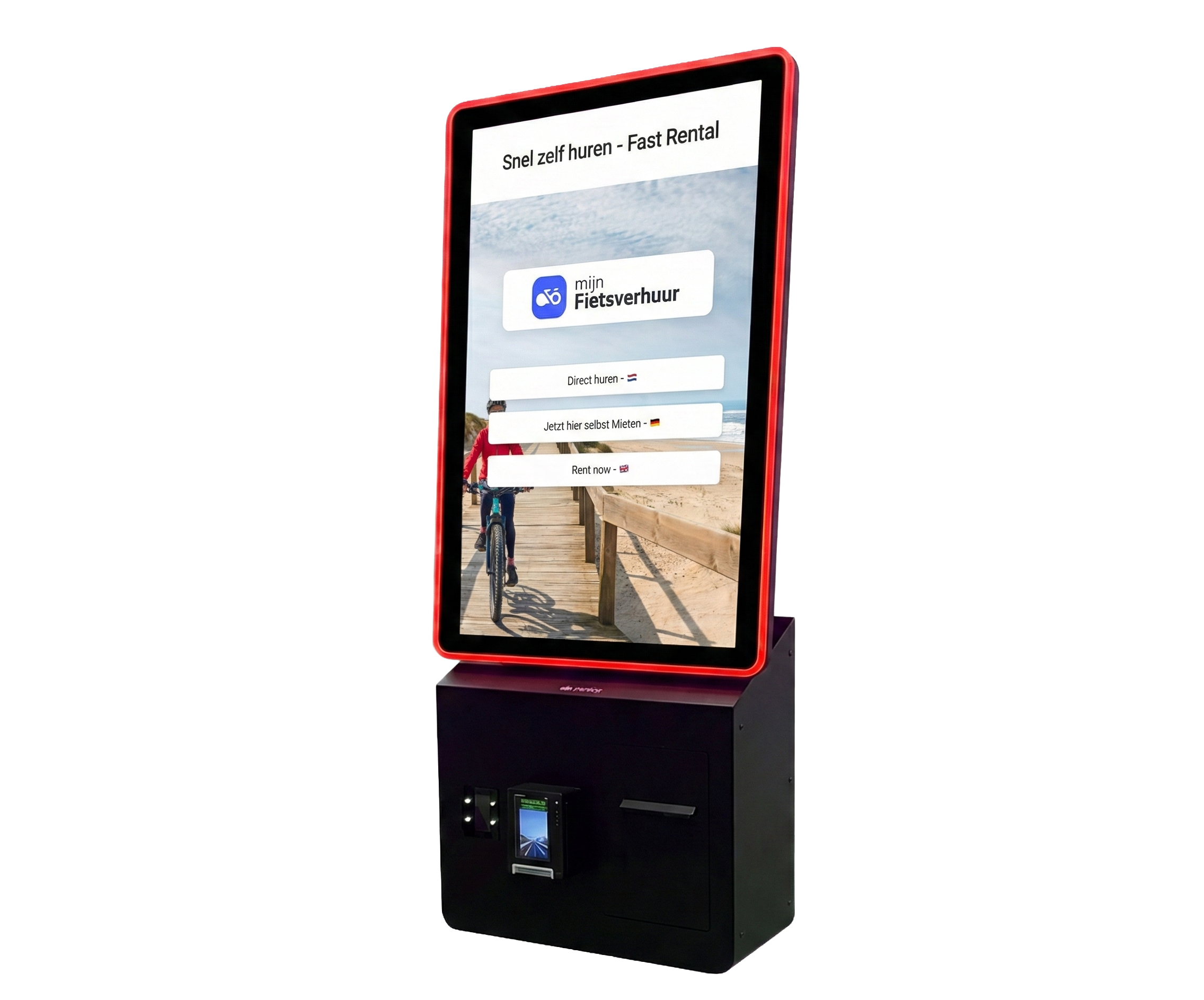 Laat klanten zelf fietsen huren en betalen, terwijl jij tijd overhoudt en de doorstroming op piekmomenten verbetert. De MijnFietsverhuur self-service kiosk neemt reserveringen en betalingen uit handen, volledig geïntegreerd met jouw verhuursysteem.